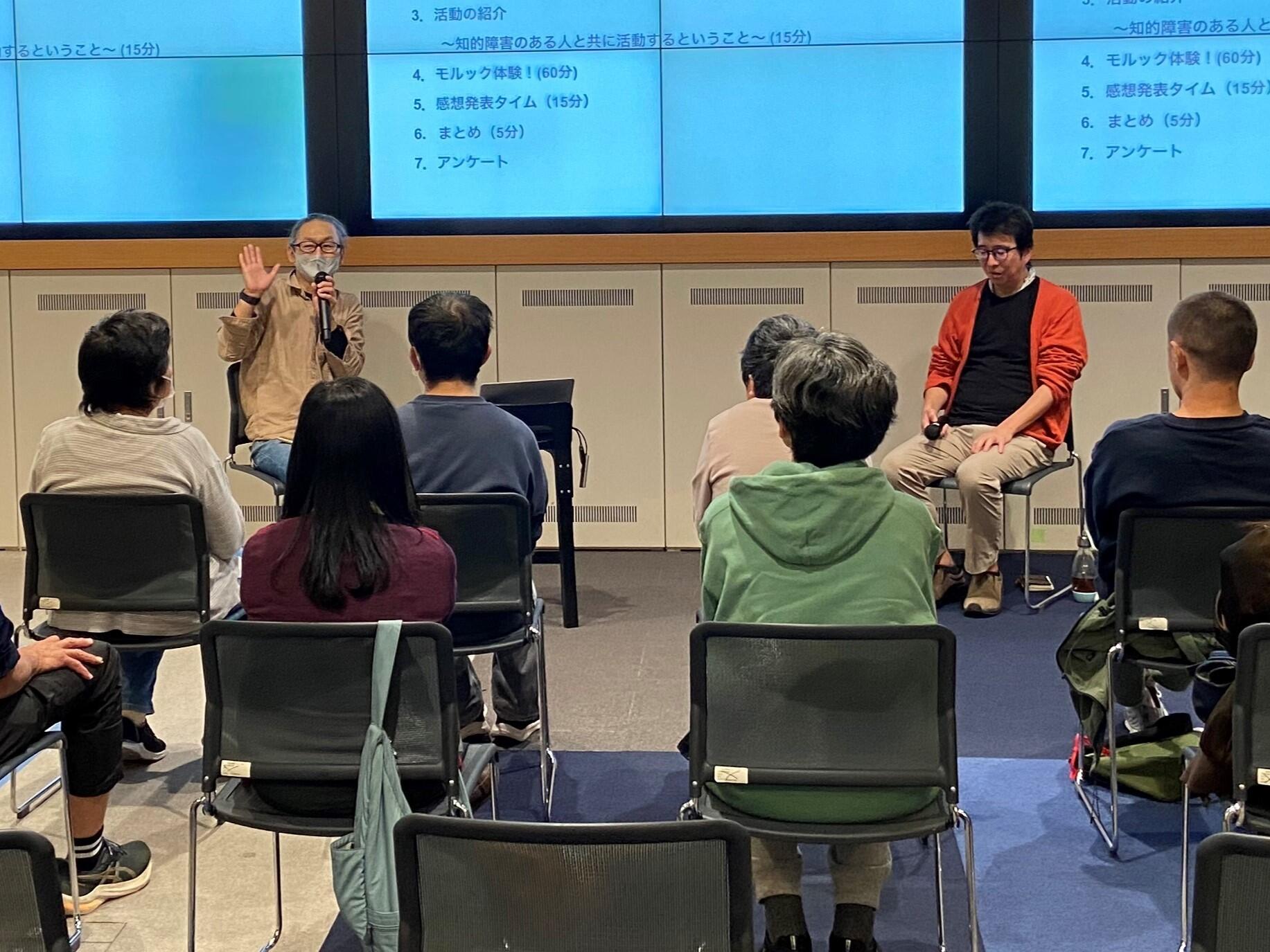 セミナーでは、渋谷区知的障がい者幡ヶ谷教室「GAYA」の運営委員長である浦野耕司さんと同じく渋谷区知的障がい者恵比寿教室「えびす青年教室」の運営委員長の稲沢憲さんによる対談が行われました。「知的障がいのある人と共に活動するということ」をテーマに、それぞれの教室の理念や日々の活動、ボランティアの関わり方などが語られ、参加者の理解を深める時間となりました。