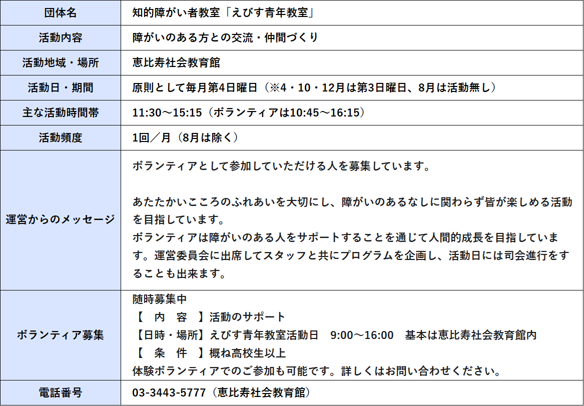 えびす青年教室は知的障がいがある15歳以上の人を対象にした、年間を通じた教室です。